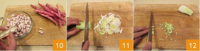 Next, shell the beans 10. Then proceed with the leek, cutting it into thin rings 11. Finely chop the celery into small cubes 12.