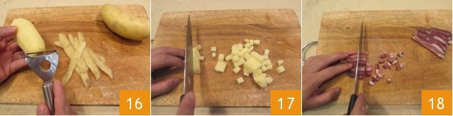 Repeat the operation with the potatoes: peel them 16, cut them into slices and then into strips, and then into cubes 17. Now cut the pancetta into thin slices and then into cubes 18.