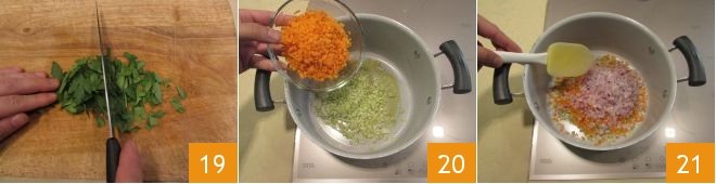 Finally, roughly chop the parsley 19. Now you have all the ingredients ready for preparation. Take a high-sided non-stick pan to prepare the How to make the soffritto: drizzle with oil and fry the celery, carrots 20, and onion, stirring the ingredients for even cooking 21. It will take about 7-8 minutes.