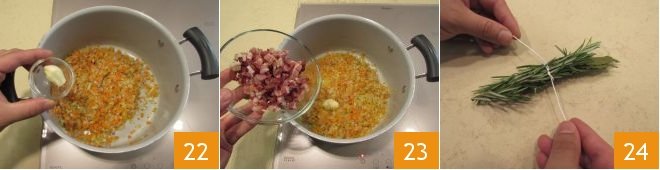 When the ingredients have browned, add the clove of garlic 22 and the pancetta 23 to flavor. Tie the rosemary sprigs and bay leaves with kitchen string 24.
