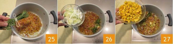 Add the bouquet of herbs to the pan 25. Now pour in the leek 26 and a bit of water to stew the ingredients over moderate heat for about 10 minutes. Then add the pumpkin 27.