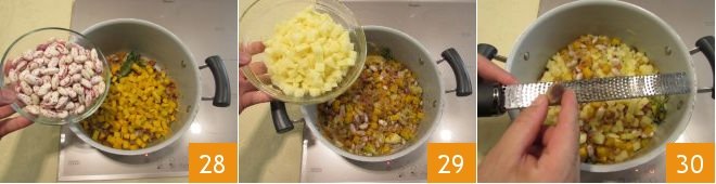Also add the beans 28 and cook for another 10 minutes over moderate heat. At this point, add the potatoes 29 and season with a sprinkle of nutmeg 30.