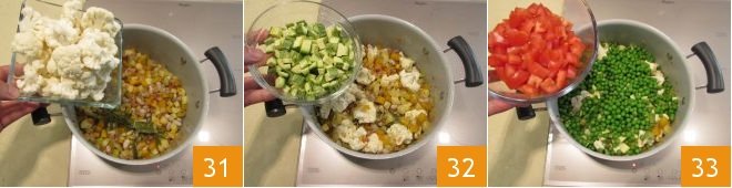 Add the cauliflower 31 and zucchini 32. Season with salt and pepper and cook for about 5-6 minutes over moderate heat. Then add the peas and tomatoes 33.