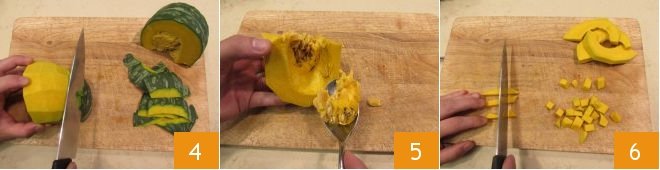 Proceed with the preparation of the minestrone: wash and dry all the vegetables. Take the pumpkin, remove the skin with a large-bladed knife 4, then remove the seeds and inner strings with a spoon 5. Cut it into slices of the same thickness and then into cubes about 1 cm on a side 6.