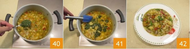 Two minutes before the end of cooking, add the pesto 40 and mix the ingredients well to blend them 41. Your pasta, vegetable, and pesto minestrone is now ready to be enjoyed 42!