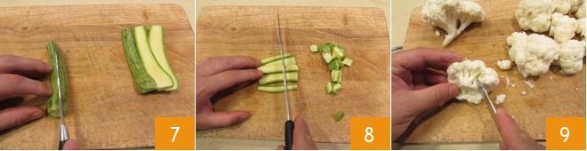 Move on to the zucchini: trim it and cut it into slices 7 and then into cubes 8. Now separate the florets from the cauliflower 9.