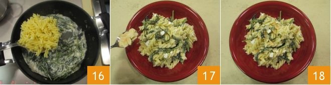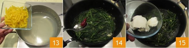 In the meantime, cook the pasta in boiling water 13 so that it's al dente (refer to the cooking time on the package and drain it a couple of minutes earlier). By now, the agretti should be cooked; remove the chili pepper 14 and add the ricotta 15 and mix.