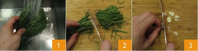 To make pasta with agretti and ricotta, first wash the agretti under running water 1, then cut them in half 2 and set them aside. Peel the garlic and slice it finely 3.