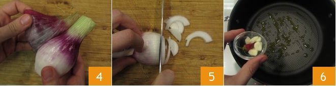 Clean the spring onion by removing the ends and the outer layer 4; then slice it 5. Place a pot full of water on the heat and bring it to a boil with salt: this will be used to cook the pasta later. In a large pan, heat the olive oil, add the garlic along with the whole chili pepper 6.