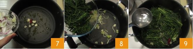 then add the sliced spring onion 7. Sauté gently for about 5 minutes, then add the agretti 8, and pour in a ladle of pasta cooking water 9.