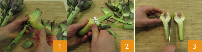 To prepare pasta with artichoke ragù, let's start with the seasoning. Remove the outermost leaves of the artichokes 1, if they have thorns, use a cloth to avoid pricking yourself, and with a small knife peel from the stem to the base 2. Cut the tips cleanly and divide the artichoke in half 3.