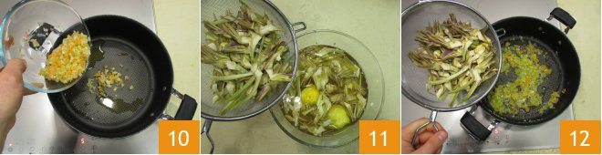 and add the chopped vegetables 10. Let them stew for 5 minutes before adding the artichokes: drain only 2/3 of them 11 and toss them into the pan 12.