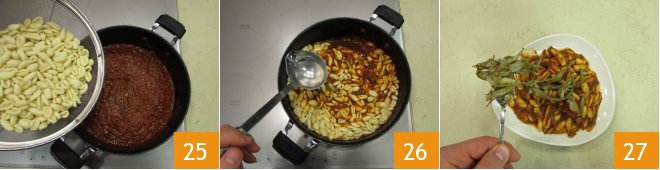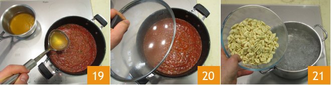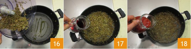 Return to the pan, adding a drop of oil if necessary 16, raise the temperature a bit, and then deglaze with red wine 17. When the alcohol evaporates, add the tomato sauce 18.