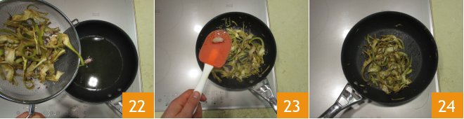 Drain the remaining artichokes and briefly sauté them in a pan with a drop of oil, a clove of garlic, and adjust the salt 22, remove it at the end of cooking 23, and remember they should be well-roasted 24.