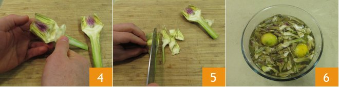 Remove the central choke 4 and finally slice thinly 5. As you go, immerse the artichoke strips in a bowl of cold water in which you have squeezed and immersed a lemon. This will prevent them from turning brown 6.
