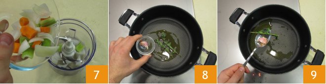 After cleaning the celery, carrot, and onion, cut them into chunks and place them in a mixer 7. Use the pulse mode to get small pieces. Proceed to cook. Gently heat some oil in a pan, a crushed clove of garlic in its skin, and sprigs of marjoram 8. As soon as the base is hot, remove the garlic and marjoram 9