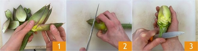 To prepare pasta with artichokes, tuna and lemon, start with the How to clean artichokes: remove the tougher outer leaves 1, then cut off the tips 2 and peel the stems 3.