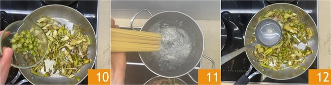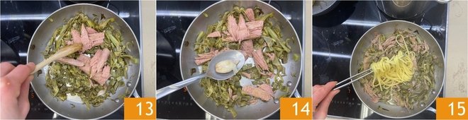 When the artichokes are tender, add the drained, flaked tuna 13. Let it flavor for a few minutes, then remove the garlic cloves 14. Drain the pasta, reserving a ladleful of its cooking water, and transfer it directly to the pan 15.