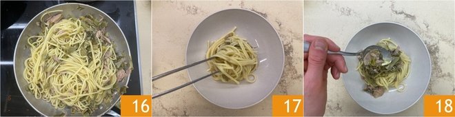 Pour in the reserved water to create a creamy sauce; toss everything well 16 and plate the pasta 17 with its sauce 18.
