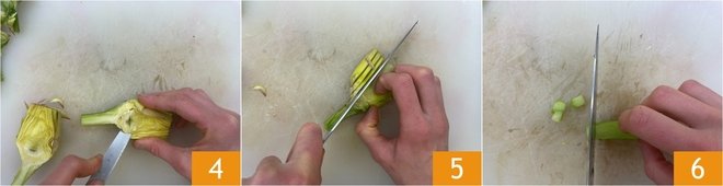 Cut the artichokes in half and remove the inner choke 4. At this point slice the leaves 5 and cut the stem into small cubes 6. Keep them in slightly acidulated water with lemon juice until ready to use, so they don't darken.
