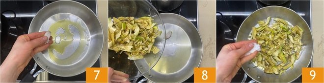 In a large skillet heat the oil with the garlic cloves 7. Let them briefly infuse, then add the well-drained artichokes 8, season with salt 9 and pepper.