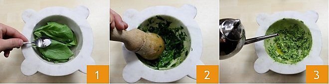 To prepare pasta with baby octopus and pesto, start with the pesto (if you don't already have homemade pesto available). To see the complete procedure, you can click on the cooking school card here: Genoese pesto (Pesto alla genovese). In a mortar (or you can use a mixer if you don't have one), crush the garlic clove into a paste. Then add the basil leaves 1 with a pinch of coarse salt. Crush the basil leaves against the walls of the mortar with the pestle, turning the pestle from left to right and simultaneously turning the mortar in the opposite direction 2. When the bright green liquid comes out from the leaves, add the pine nuts and continue grinding. Then gradually add the cheeses and continue mixing along with the extra virgin olive oil 3. Blend the ingredients. Now that the pesto is ready, set it aside.