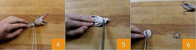 Now proceed to clean the baby octopus: wash them under running water. Then on a cutting board, one by one, separate the head from the tentacles by cutting with a knife just below the eyes to remove them 4. Again with the knife, remove the central tooth and set the tentacles aside 5. Make a small incision on the head to remove the innards 6.