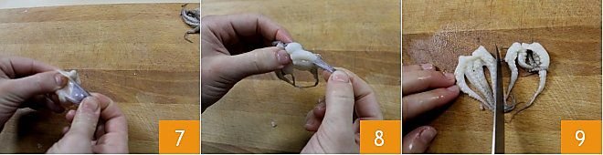 Then gently peel the skin off the head with your hands 7 and then also remove the skin from the tentacles with your hands 8. Split the tentacles in half to facilitate cooking 9.