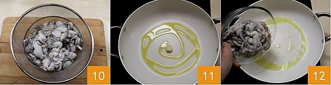 Rinse the cleaned parts of the baby octopus, head, and tentacles, under running water, then drain them 10. In a pan, heat the oil with the garlic clove 11. Then add the baby octopus 12 and sauté for a few seconds, stirring frequently.