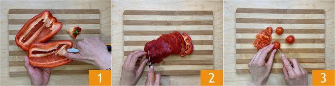 To prepare pasta with bell pepper and ricotta cream, first wash the bell peppers, remove the top with the stalk, cut them in half, and remove the seeds inside. Then slice them into strips 2. Wash and cut the cherry tomatoes in half 3.