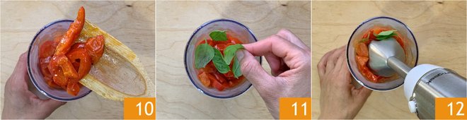Pour the bell peppers and tomatoes into a tall glass 10, add the basil leaves 11, and blend with an immersion blender 12.