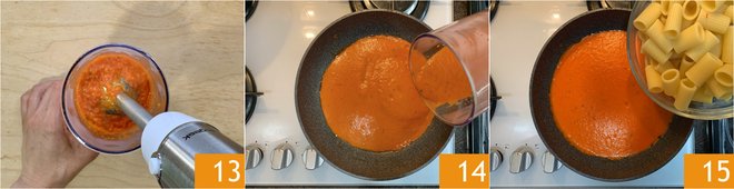 You need to obtain a smooth cream 13. Pour the cream into the pan used for cooking the vegetables 14 and drain the pasta here as well 15.