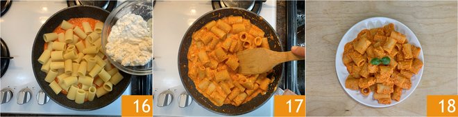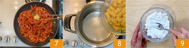 Add the ricotta 16 and toss everything just long enough to mix the seasoning 17. Serve the pasta with bell pepper and ricotta cream piping hot 18.