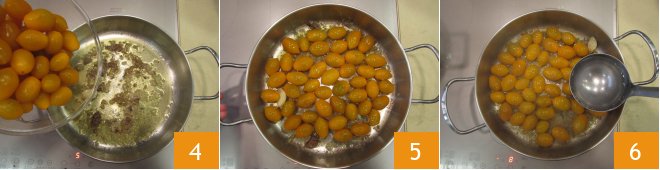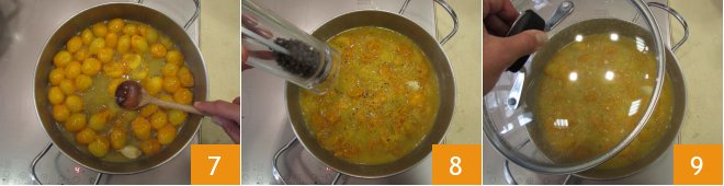 Add the whole yellow cherry tomatoes 4, let them flavor for a moment 5, and pour in a ladle of hot water taken from the pasta pot 6.
