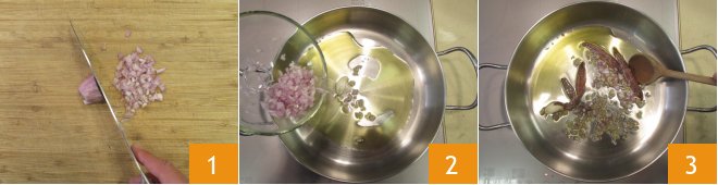 To prepare pasta with Cantabrian anchovies and burrata stracciatella, start with the sauté. Crush a garlic clove with a knife and then chop the shallot 1. Place a pot of water on the stove to cook the pasta and in the meantime, pour a swirl of oil in a saucepan and add the garlic and shallot 2. Then add the Cantabrian anchovies and gently fry for 5 minutes, stirring with a wooden spoon 3.