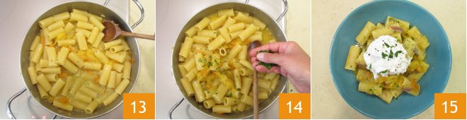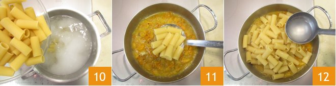 After 10 minutes of cooking the sauce, cook the rigatoni 10. When there are 3-4 minutes left before the pasta is done, remove the garlic from the sauce, drain the pasta, and transfer it into the sauce 11. Add some pasta cooking water and finish cooking the pasta like risotto 12.