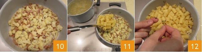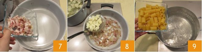 Meanwhile, sauté the guanciale strips in a pan over medium heat for 5 minutes 7, they should be just crispy, there’s no need to add oil. At this point, the cauliflower florets will be ready, so scoop them out with a slotted spoon directly into the pan with the guanciale 8 and you can cook the pasta in the same water 9 for 12 minutes or the time indicated on the package.