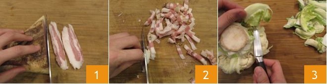 To make pasta with cauliflower and guanciale, slice the guanciale 1 then cut each slice into strips 2 and set them aside. Place a pot full of salted water on the stove and bring it to a boil. In the meantime, take care of the cauliflower: remove the leaves 3