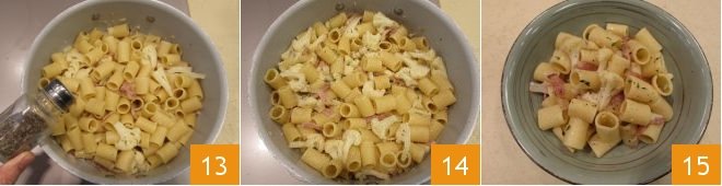 adjust with salt and pepper 13 and mix with a spoon. Your pasta with cauliflower and guanciale is ready 14, enjoy it hot 15!