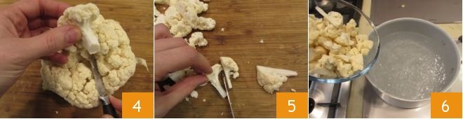 and cut off the individual florets by cutting into the base of the stem 4, then halve the florets 5, and boil them in the boiling water for 5 minutes 6.