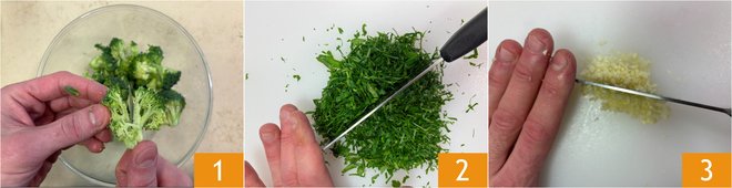 To prepare pasta with chicken and broccoli, first make the chicken broth following our recipe and keep it warm. Wash the broccoli, cut the florets 1, and set aside. Chop the parsley 2 and the garlic 3.