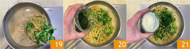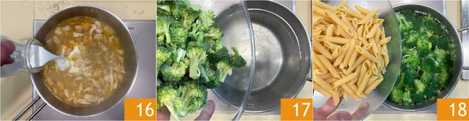 Add the cream 16 and cook over low heat for 5 minutes. Meanwhile, cook the broccoli in salted boiling water 17 for 2 minutes, then add the pasta 18 and cook for the time indicated on the package.
