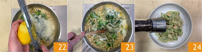 Also add the lemon zest 22 and toss for a few minutes 23, just long enough to combine the ingredients. Serve and finish with a sprinkle of black pepper 24.