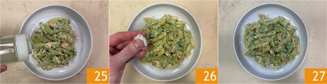 Finish with a drizzle of raw oil 25 and a pinch of grated Parmesan cheese 26. Your pasta with chicken and broccoli is ready to enjoy 27.