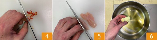 Slice the fresh chili pepper 4 and cut the chicken into strips 5. In a pan, pour a drizzle of oil, add the butter 6, and melt over medium heat.