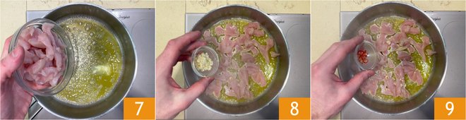 Add the chicken 7, the garlic 8, and the chili pepper 9.