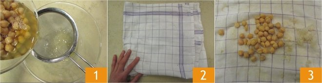 To make the pasta with chickpea ragù, first drain the pre-cooked chickpeas 1, then place them on a clean cloth and rub them gently to remove the skins 2 3.