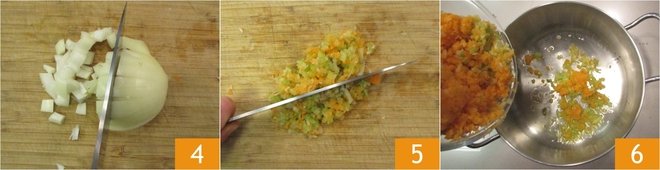 Now peel and finely chop the onion 4, celery, and carrot 5. Pour the chopped vegetables into a pan with a drizzle of oil 6.