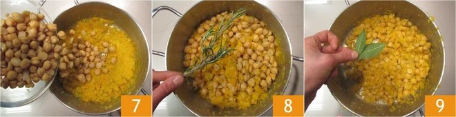 When the soffritto is wilted, add the chickpeas 7 and rosemary 8. Sauté the chickpeas for 5 minutes, then remove the rosemary and add the bay leaves 9.