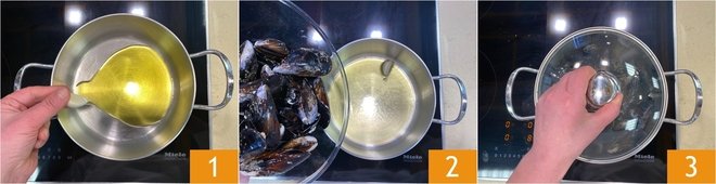 To prepare pasta with chickpeas and mussels, start by cooking the mussels: heat a drizzle of olive oil in a pan with the whole peeled garlic clove 1, add the cleaned mussels 2, cover with a lid 3 and cook over high heat for 5-8 minutes, until they open.